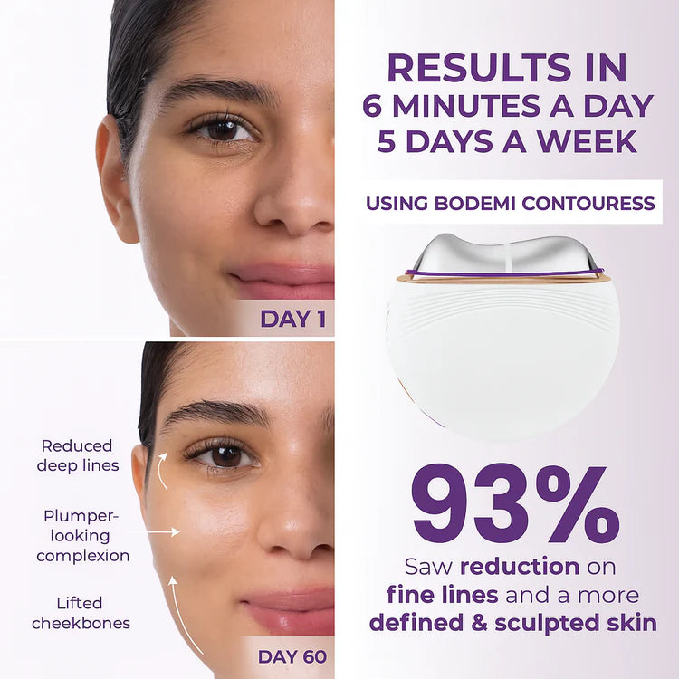 In just 6 minutes a day, 5 days a week, Bodemi Contouress helps visibly reduce fine lines, lift cheekbones, and reveal a plumper, more sculpted look—just like 93% of users experienced.